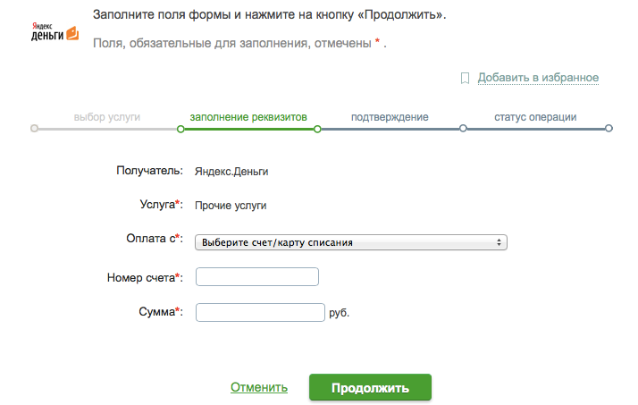 Укажите номер счета в Яндекс.Деньгах и сумму пополнения, затем нажмите «Продолжить».